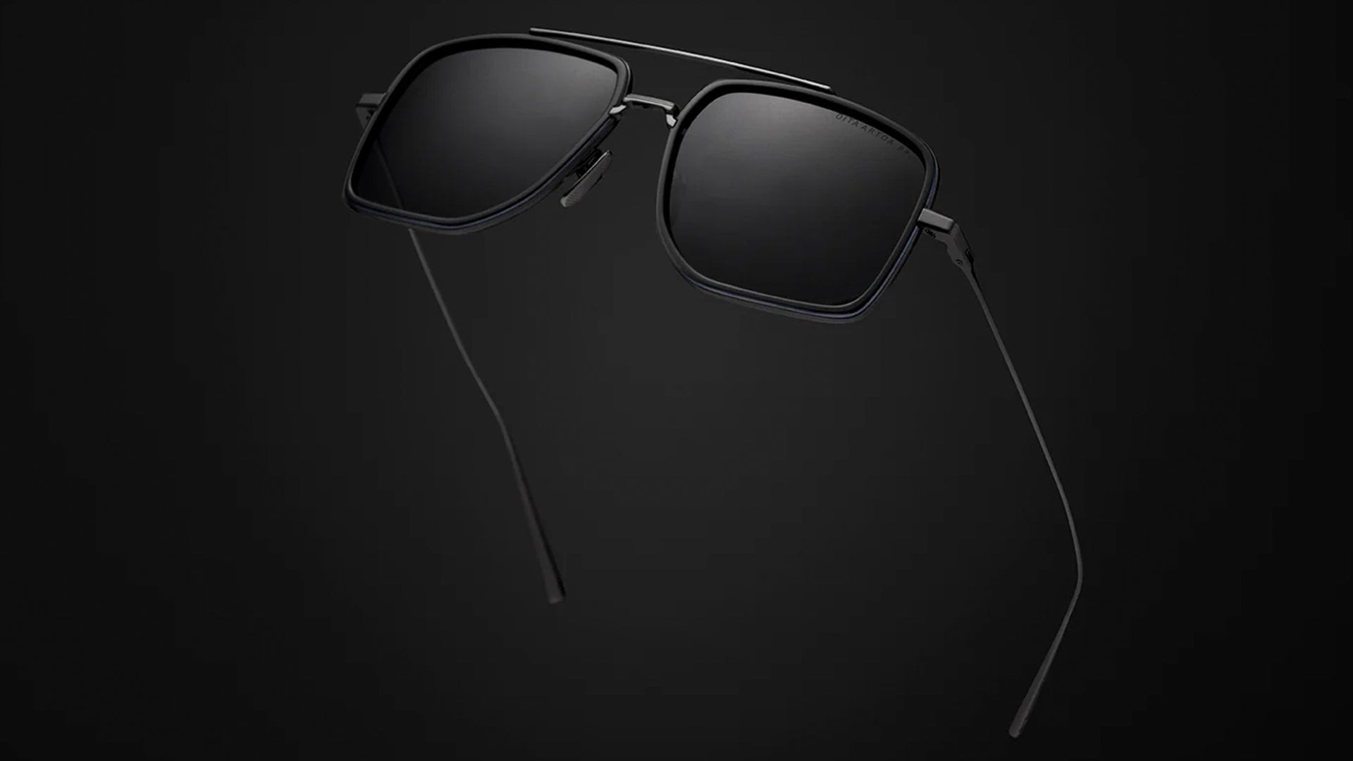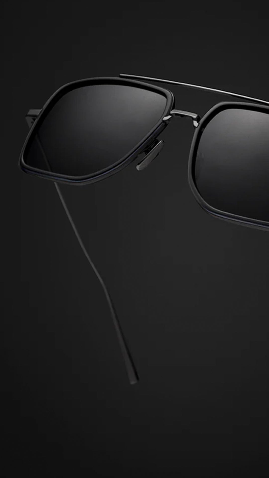 Stylish sunglasses with a sleek gold frame and dark lenses are suspended in darkness, highlighting their modern, sophisticated design.