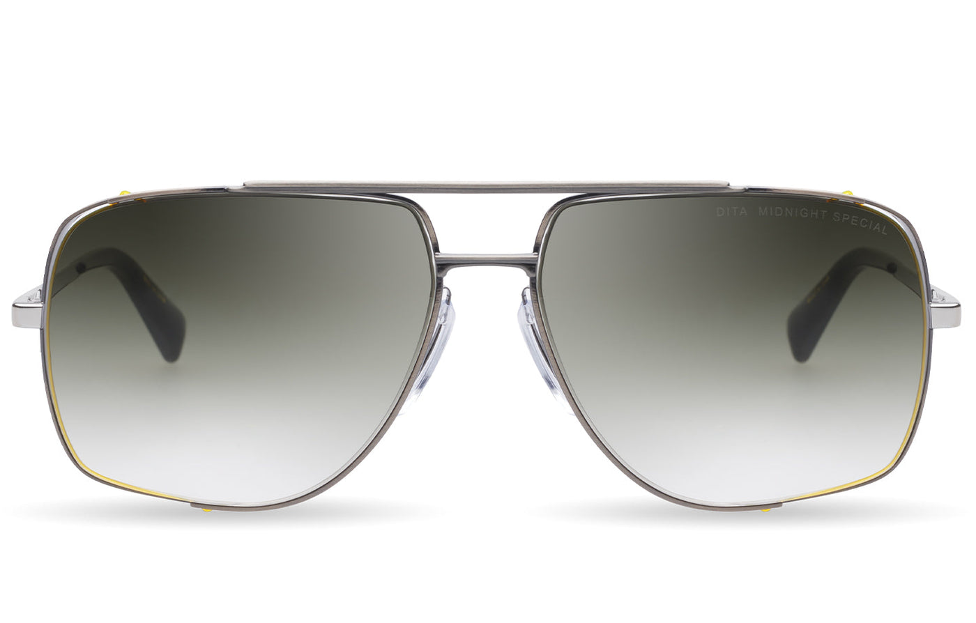 Close-up of sleek black aviator sunglasses with reflective dark lenses on a black background. Text reads "The Blackout Collection," conveying elegance.